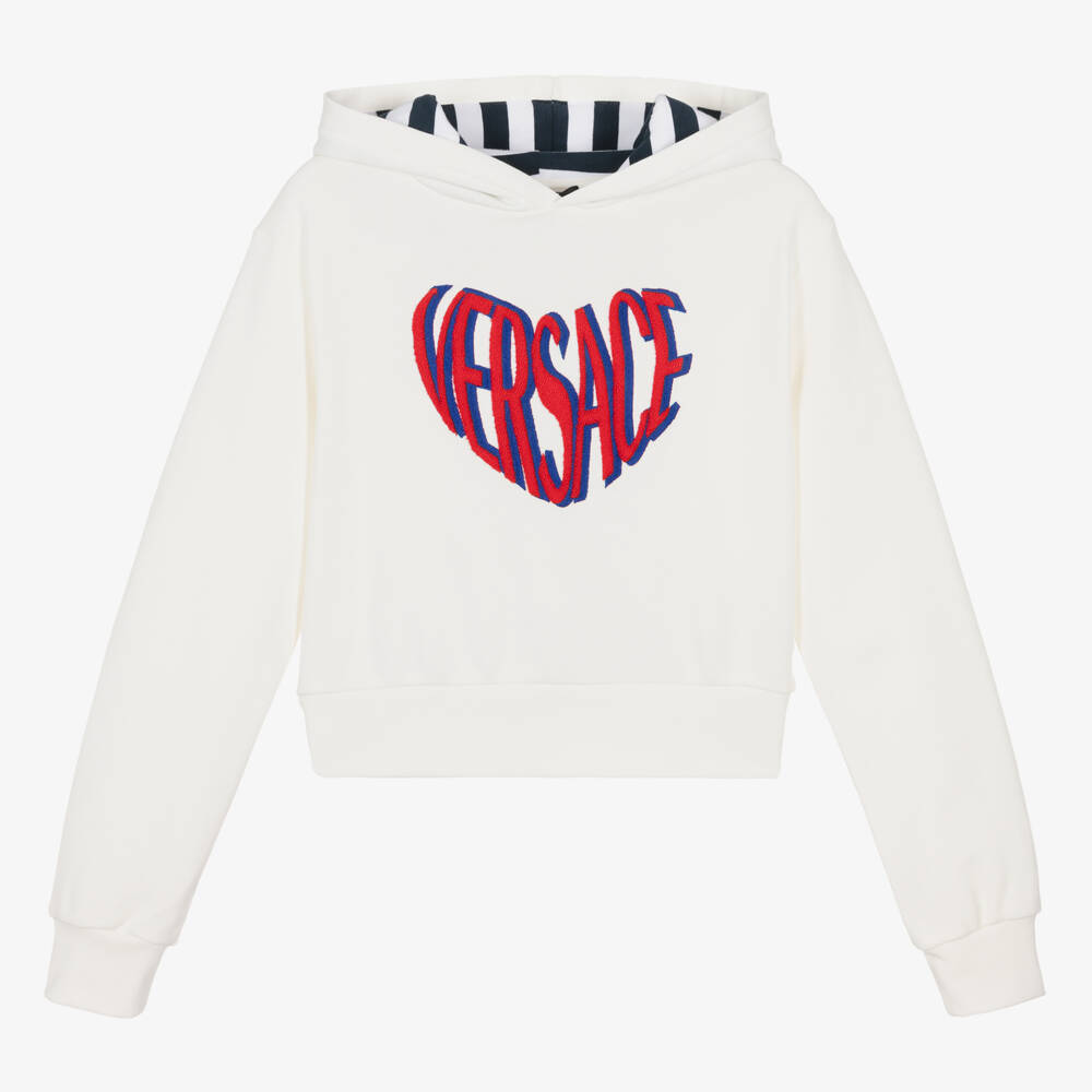 Teen girls ivory cotton hoodie by luxury fashion house, Versace. This elevated, casualwear style has long sleeves and a bold red heart logo embroidered on the chest. Instantly recognisable by the Italian designer, it is playful, fun and love-inspired.