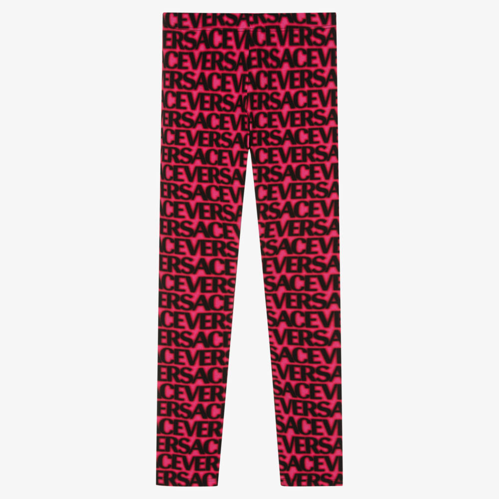 Stand-out in these fuchsia pink leggings for teen girls by luxury fashion house, Versace. Boldly distinctive, the brand's signature logo is printed all-over in a blurred black effect for added edge. They are made from the softest cotton jersey, in a full-length with an elasticated waist.