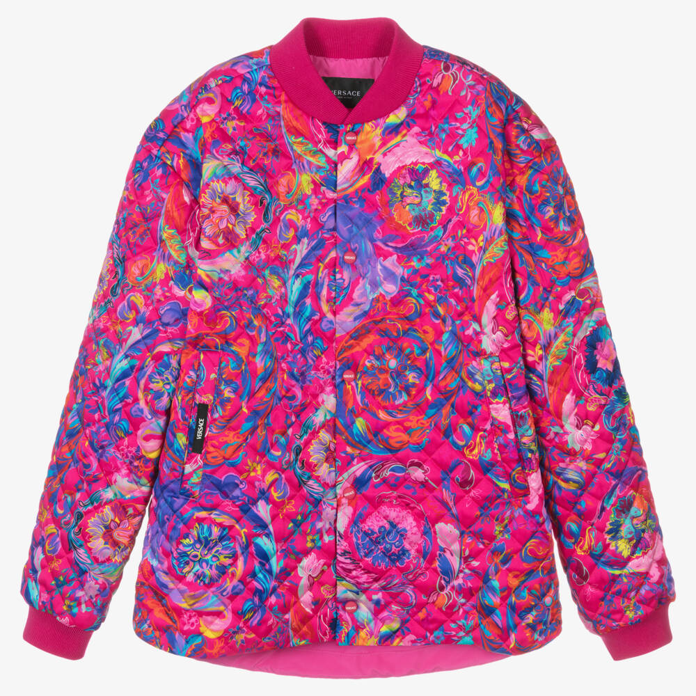 Vibrant fuchsia pink bomber jacket for teen girls from Italian luxury brand Versace. Mid-weight and quilted, this head-turning jacket bears the designer's modern Kaleidoscopic Barocco pattern in pink, purple and neon green. It has all the typical details of a bomber jacket, with ribbed trims, front pockets, and branded popper fastenings.