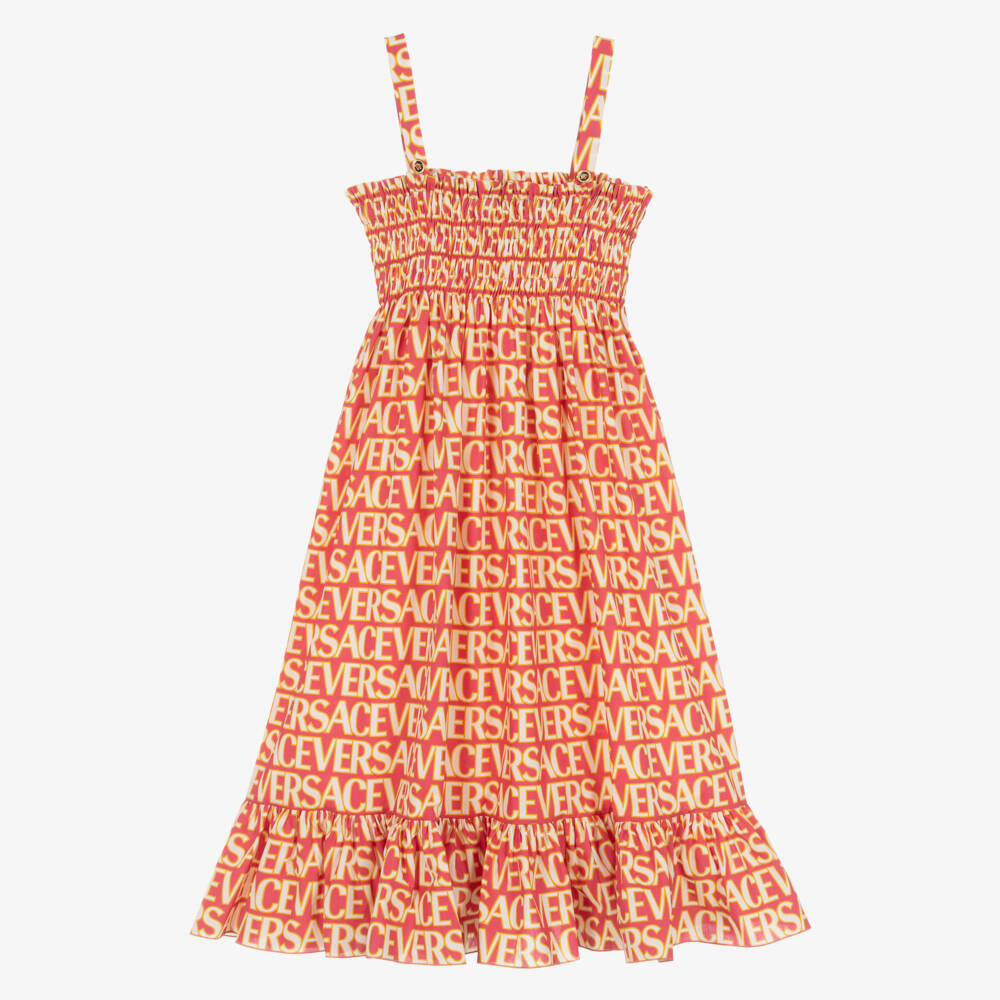 Designed by luxury brand Versace, this pink midi dress for teen girls is made in luxuriously lightweight cotton poplin. The stretchy, shirred bodice adds comfort and feminine styling. It has a striking logo print with opulent gold edges and gold Medusa buttons on the straps for added designer detail.
