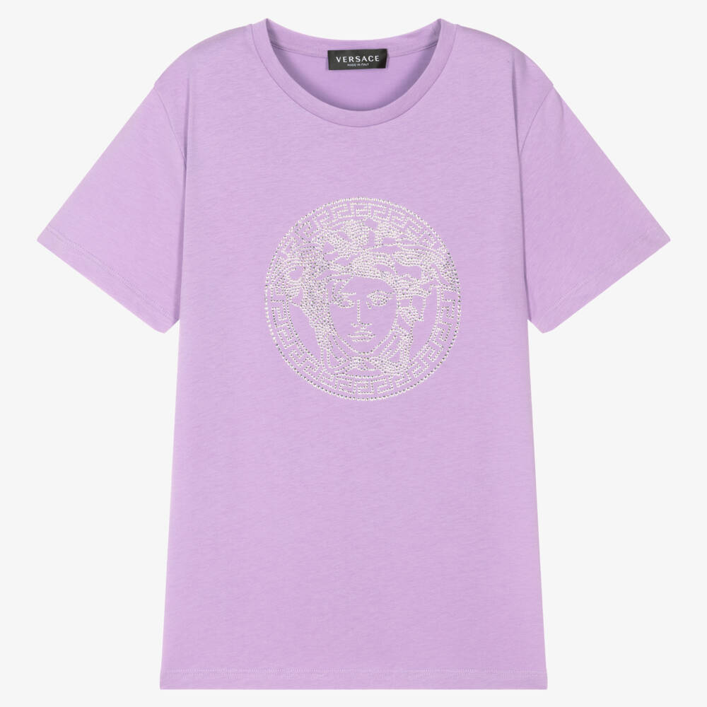 A classic violet purple T-shirt for teen girls by luxury designer Versace, with a glamorous twist. Stylish yet casual, it has a fabulous crustal embellished Medusa on the front for a recognisable look. Made in soft cotton jersey, this classic tee promises a relaxed, on-trend look.
