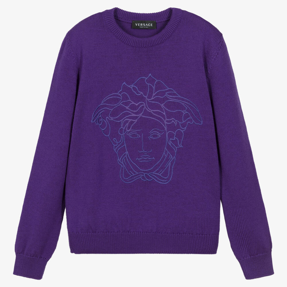 Stylish purple sweater for teen girls by luxury Italian brand Versace, with the brand's iconic Medusa logo embroidered on the front in tonal purple. Great for casual styling on colder days, it is knitted in luxuriously soft virgin wool, with a ribbed neckline, cuffs and hem.