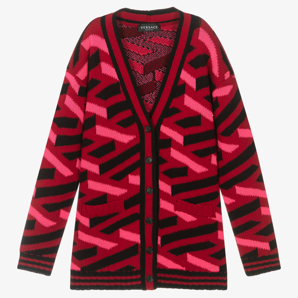 Teen girls Mini-me red V-neck cardigan by Italian brand Versace. So stylish with the brand's distinctive La Greca pattern in bright pink and black, it is knitted from beautifully soft wool for a warm and cosy feel. There are two faux front pockets and ribbed red and black striped trims. The branded, black button fastening give it a lovely finishing touch.
