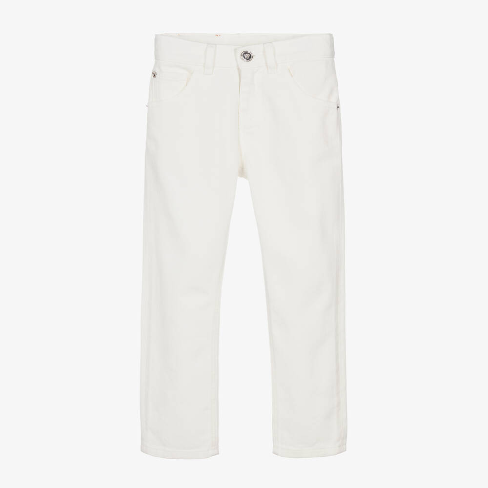 White denim jeans for boys and girls by luxury Italian designer Versace, with the signature Medusa logo embossed on the shiny silver button fastening. With a matching silver Medusa rivet on the coin pocket, they have classic, five pocket styling and a logo badge on the waistband, which is adjustable for a comfortable fit.