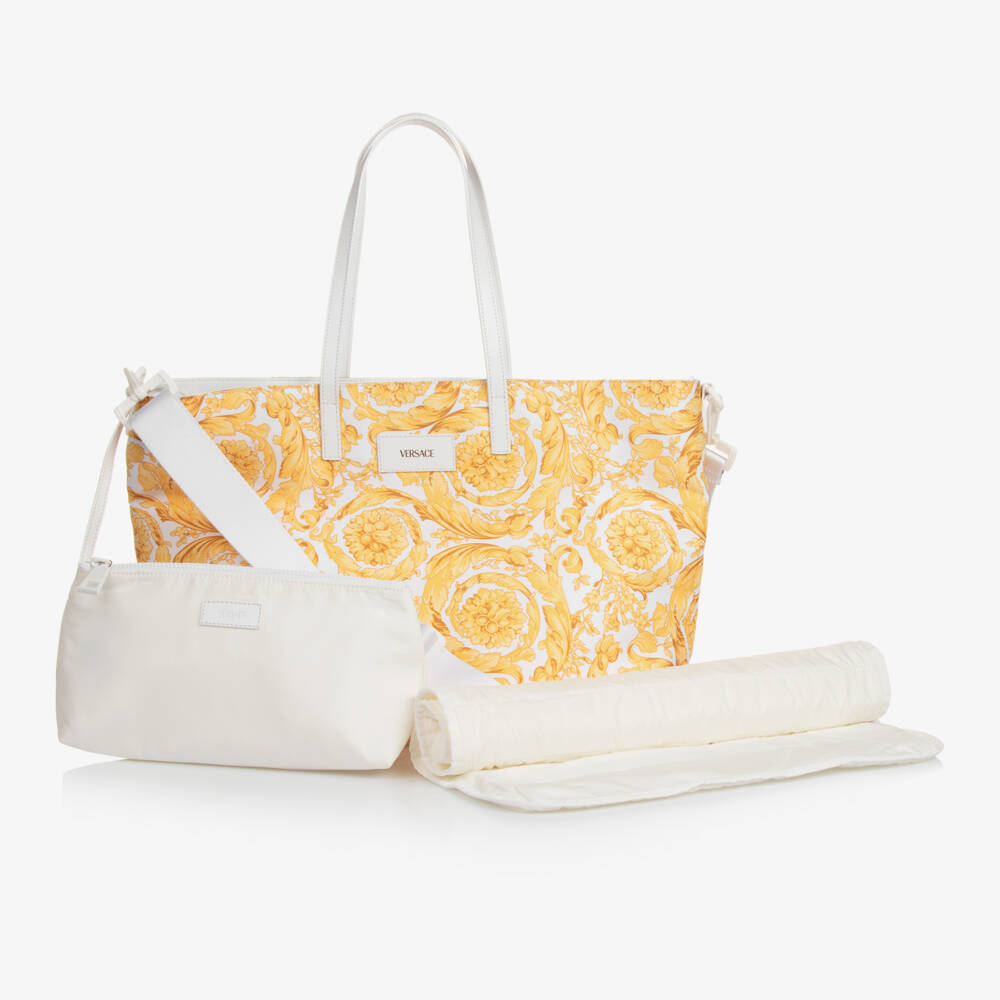 White and gold changing bag by luxury Italian designer, Versace. Opulent logo detailing can be seen across this accessory, from the gold Barocco logo print to the small leather logo badge with gold foiling. The spacious main compartment has zip and elasticated pockets on the inside and securely fastens with a smooth zip. It comes with a quilted changing mat for changing baby on-the-go and zip-fastening pouch, great for storing small essentials and keeping organised. It has fixed carry handles and a detachable, adjustable shoulder strap for versatile wear.