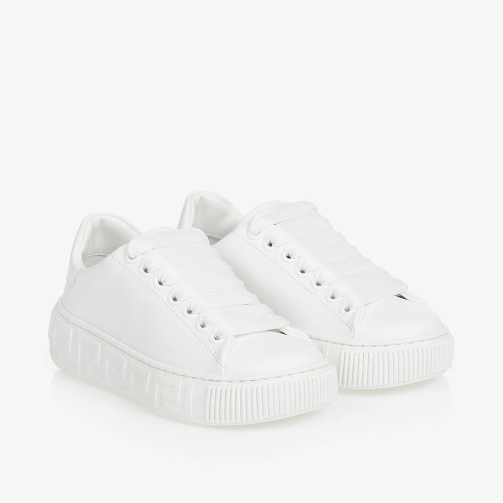 Simply styled, these white trainers for boys and girls are by luxury Italian brand Versace. Easy to pair with any outfit, they have the iconic Greca pattern moulded around the sides of the midsole and a gold printed logo on the back of the heel for a signature finish. The tonal laces conceal a black and white Medusa logo patch stitched to the tongue for an added branded touch. Made from smooth faux leather, they have a soft leather lining and a non-slip rubber outsole for good grip.