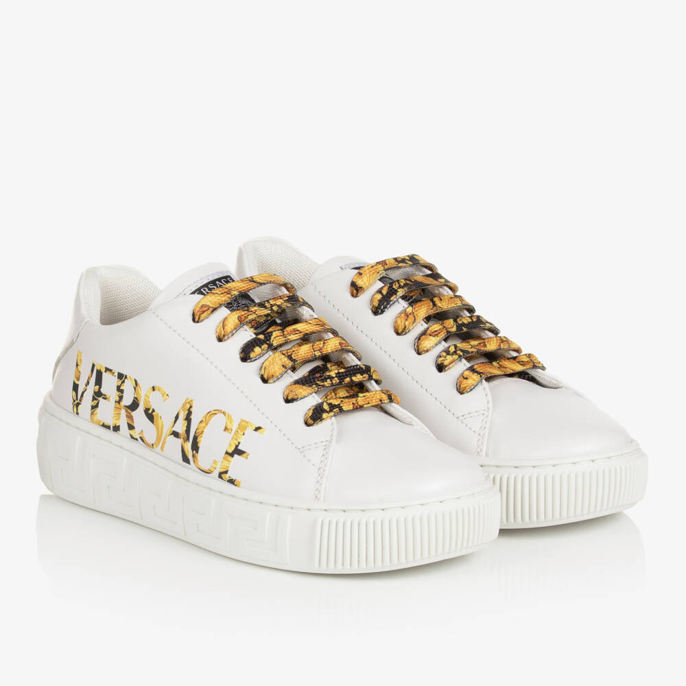 White leather trainers for boys and girls by luxury Italian fashion house Versace. Distinctively designer, the iconic gold Barocco design is decorated on the laces, with a matching logo print on the side. The tongue has a Medusa logo badge, and the rubber outsole is embossed with the Greca motif. A padded textile lining and smooth leather insole finish the shoe. They come with an extra pair of white laces to switch up the look.