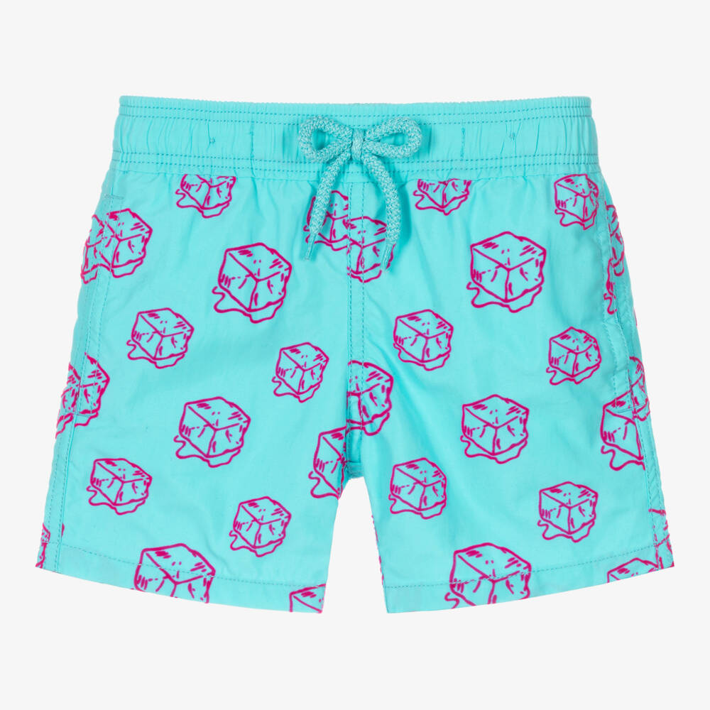 Boys blue and pink swim shorts by Vilebrequin, made in silky polyester. This mini-me design is part of the JRP Editions collaboration capsule by John M Armleder, with a flocked melting ice cubes print. The waist is adjustable internally and has a faux drawstring on the front. There are pockets on the front and a velcro closing back pocket.