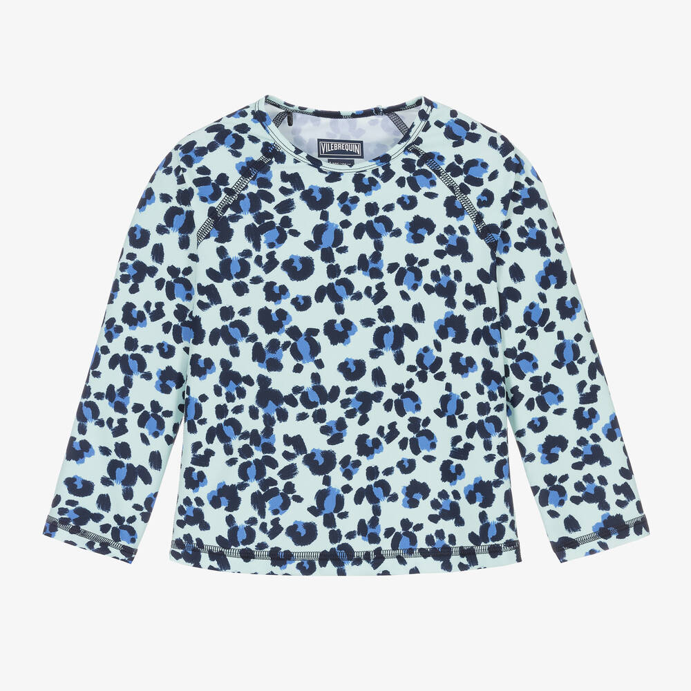 Mini-me turquoise blue top for little boys by Vilebrequin, with UPF 50+ sun protection. Silky and stretchy with excellent coverage, it is made using recycled material that is sun cream, chlorine and pilling resistant. Patterned in a fun blue and black animal print, this functional and stylish top is ideal for use in the pool or at the beach.