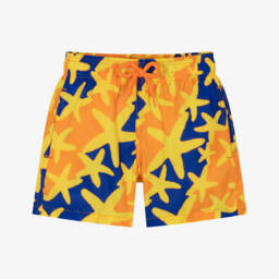 Blue water-reactive swim shorts for boys by luxury French brand Vilebrequin. Smooth with a lightweight mesh lining, a tonal seaweed pattern magically appears when the shorts are immersed in water. They have a faux drawstring detail on the front and a navy blue logo patch on the back of the comfortable elasticated adjustable waistband. Complete with side seam pockets and a velcro-fastened flap pocket on the reverse, there is an embroidered seaweed motif near the hemline.