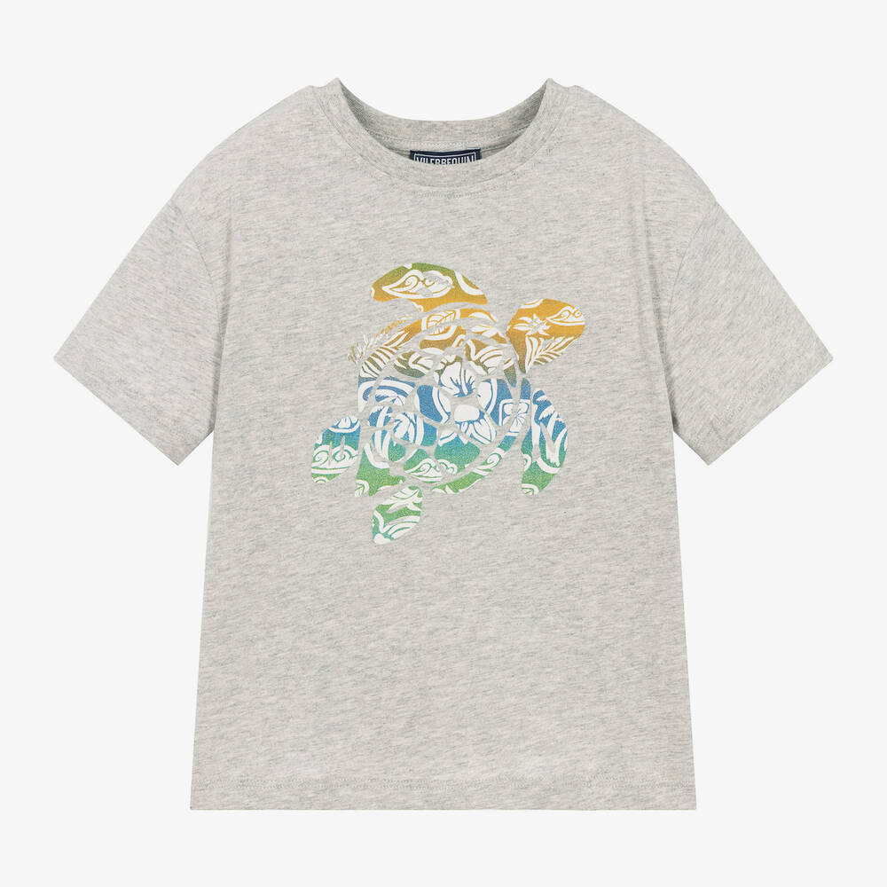 A casual grey marl T-shirt for boys by Vilebrequin, made from super soft organic cotton jersey. This crew neck tee features the brand's signature sea turtle motif in a colourful Hawaiian-style pattern for a tropical finish.