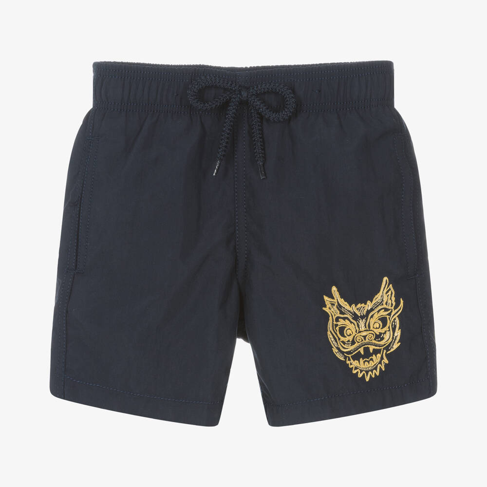 Mini-me navy blue swim shorts for boys by luxury French brand Vilebrequin, made from recycled, quick-drying fabric. Great for the pool or beach, these soft and lightweight shorts have an adjustable waist with a decorative bow on the front. They have two side pockets and an additional pocket on the back with a velcro flap. The seamless mesh lining ensures a comfortable fit and feel. A yellow dragon motif is embroidered on the front and a distinctive logo patch can be seen on the back.