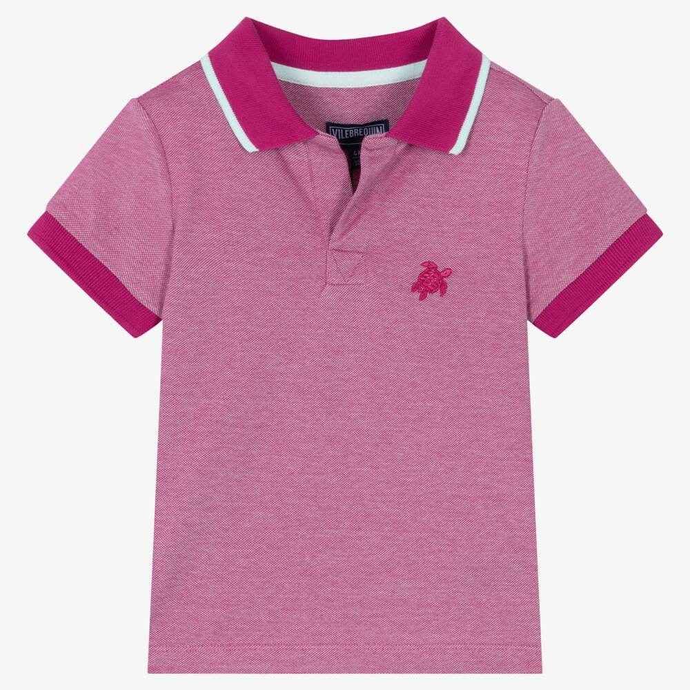 Boys Mini-me purple polo shirt by French brand Vilebrequin, made from soft and stretchy organic cotton piqué. Seen in the adult collection, this classic piece features the brand's signature turtle logo on the chest in tonal embroidery. The ribbed collar is detailed with a contrast pale blue trim and styled with a casual, open placket for a relaxed look.