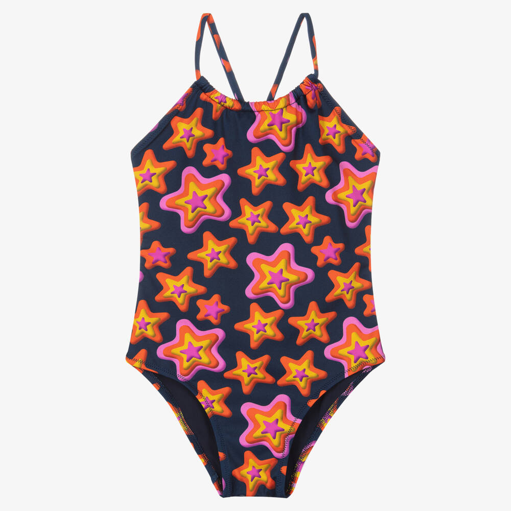 Navy blue swimsuit for girls from luxury French brand Vilebrequin, with a vibrant star pattern in orange, yellow and pink. Inspired by the main collection, it has a gathered neckline and the straps meet at the back and attach to a tortoiseshell-style ring for a stylish touch. Silky smooth and stretchy, it is fully lined for comfort and has a embroidered logo tab on the back to complete the look.