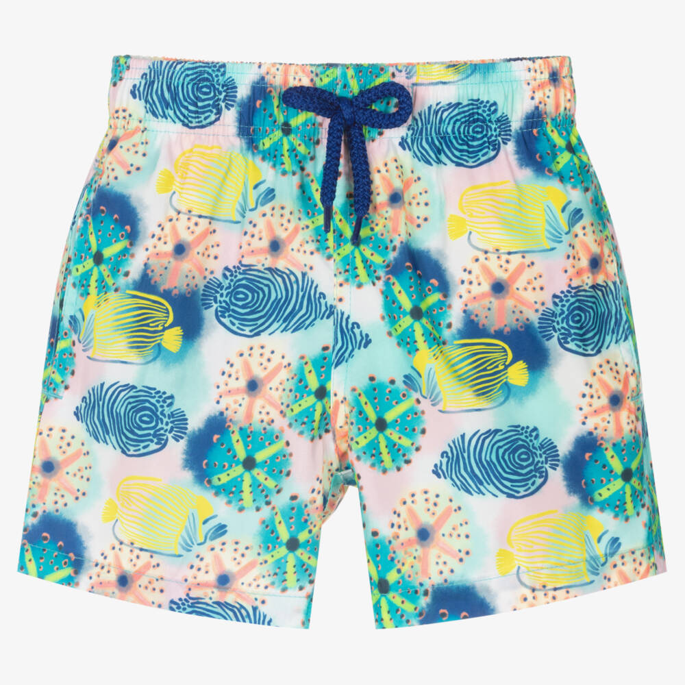 Boys blue, green and pink Mini-me swim shorts by Vilebrequin, with an urchins and fishes print. They are made in recycled polyester with concealed side pockets and a seamless mesh lining for optimal comfort. The waistband is elasticated and adjustable, with a faux drawstring tie and a logo badge around the back with two eyelets below to allow water to drain. The swim shorts can fold away into the zippered back pocket to become a branded pouch for easy packing.