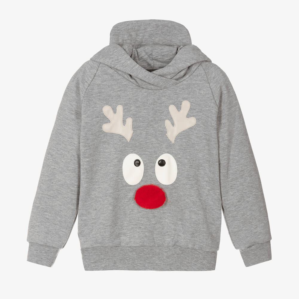 Designed by Wauw Capow, this grey marl hoodie for boys is made from soft organic cotton jersey. There is a friendly red-nosed reindeer appliqué on the front, made from faux leather patches and fluffy faux fur. It has a fleece interior for cosy comfort and a peaked hood for a cool finish.