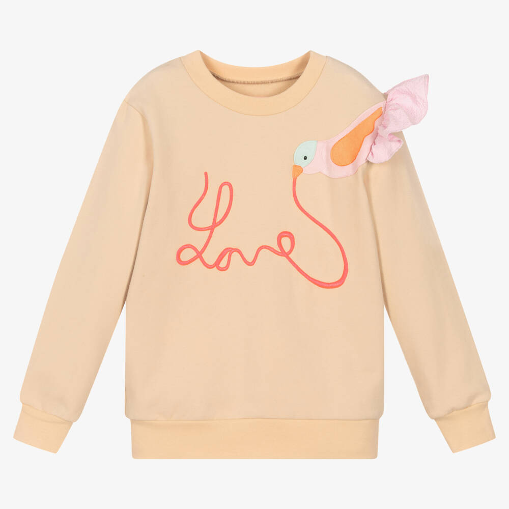 Beige sweatshirt for girls from Wauw Capow by Bangbang, made in soft mid-weight jersey with a fleecy inside. Designed with lightly ribbed trims, this classic style has a neon pink 'Love' script embroidered on the front, along with a friendly bird motif appliquéd on the shoulder. Comfortable and cute, there is a pink ruffle trim on the shoulder to look like pretty wings.