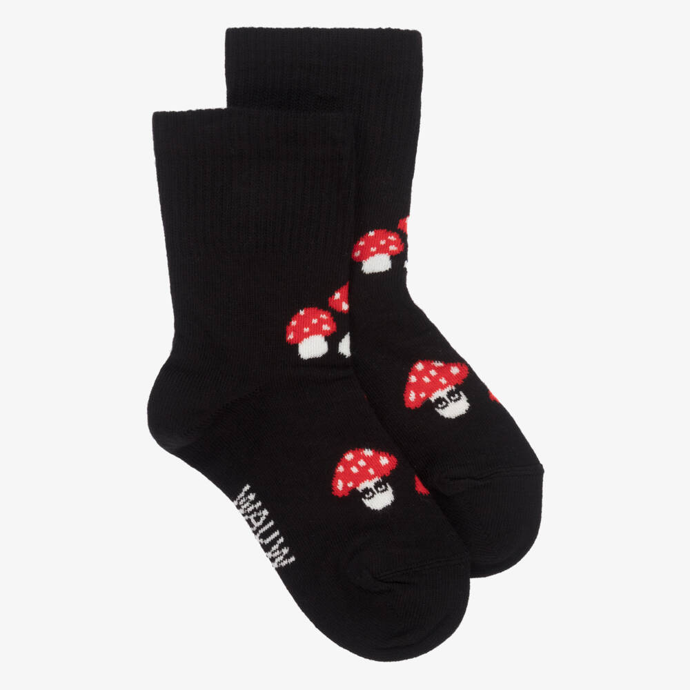 Lovely black ankle socks for girls from Wauw Capow by Bangbang. A fun touch to any outfit, they feature a quirky mushroom print in red and white. Stretchy and comfortable to wear, they have gently ribbed cuffs and the designer logo underneath the foot for an extra branded touch.