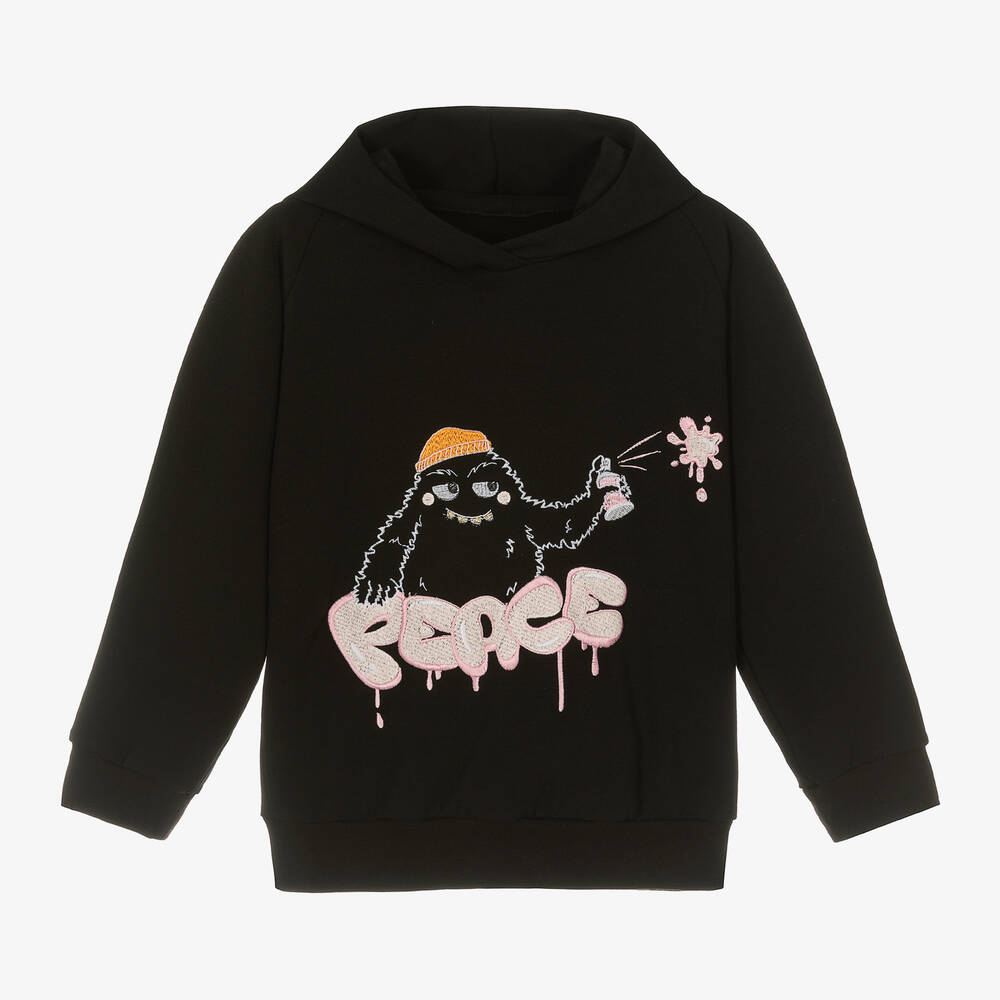 A cool black hoodie for girls by Wauw Capow, made from soft jersey with a warm, fleecy inside. There is a fun spray-painting monster design stitched on the front, embroidered with a bright orange hat and a pale pink 'peace' slogan. Comfortable to wear, it has a laid-back relaxed fit.