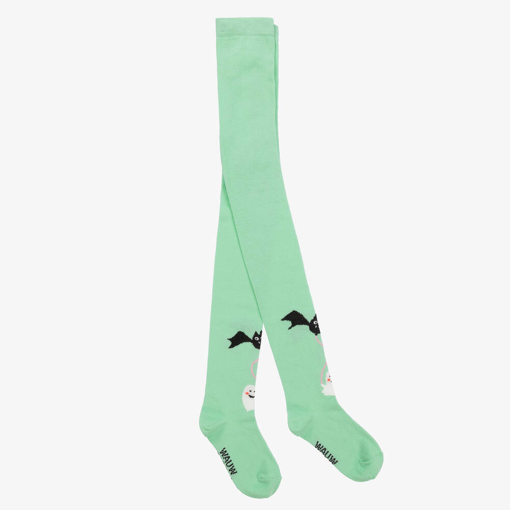 Pale green tights for girls from Wauw Capow by Bangbang, knitted in a soft organic cotton mix. A quirky style iconic to the Danish brand, they are designed with a fun white ghost motif holding a black bat-shaped balloon. The label's jacquard logo can be found on the sole.