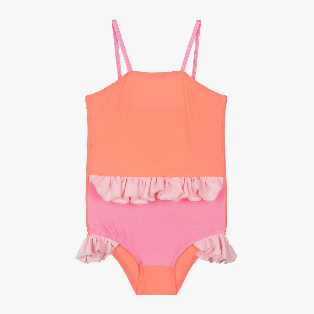 Neon coral pink swimsuit for girls by Wauw Capow. It has narrow shoulder straps, ruffles and a front panel in contrasting shades of pink. Silky and stretchy, this fabulous design features a feminine square neckline to complete the vibrant style.