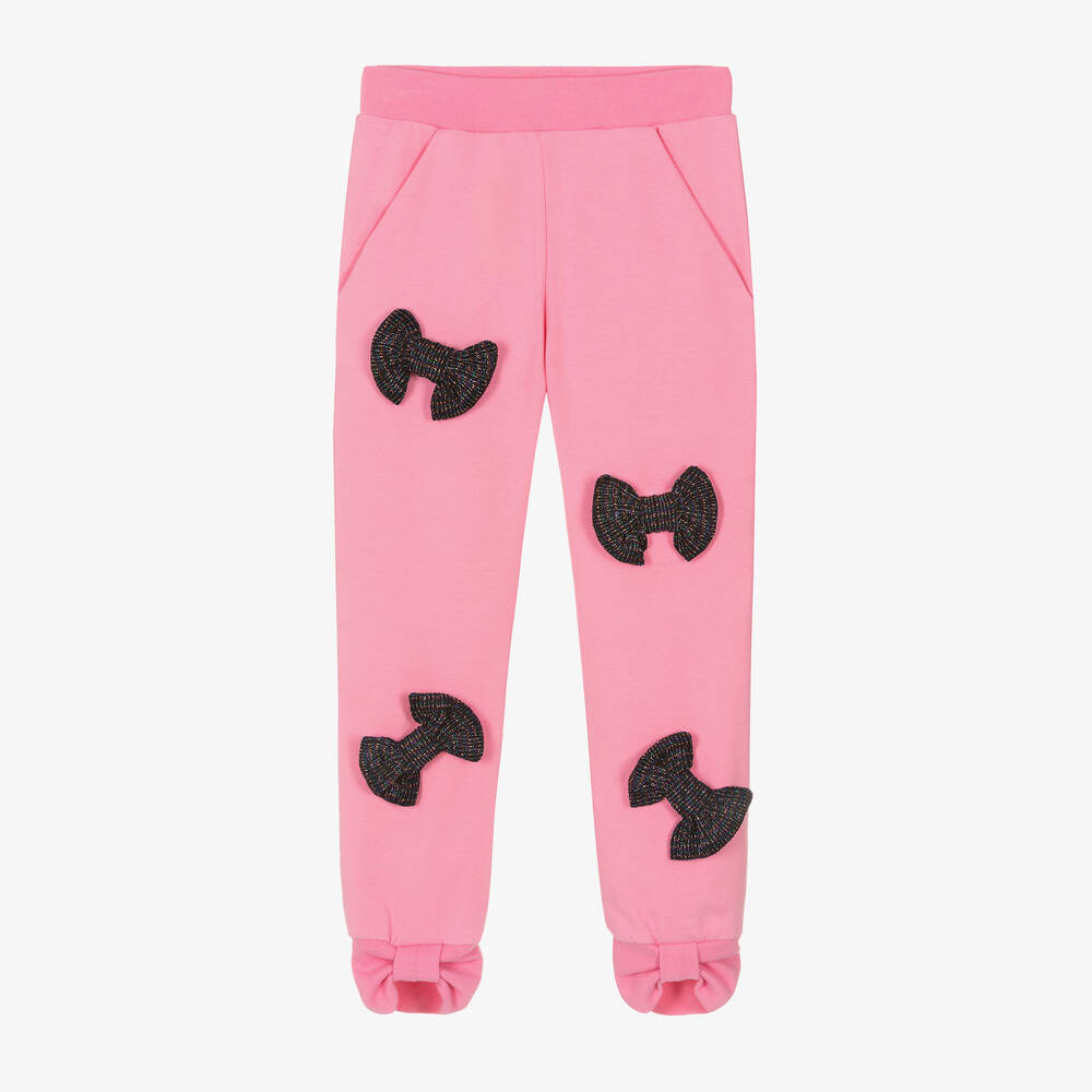 Lovely pink organic cotton joggers for girls by Wauw Capow, with a cosy fleecy inside. Ideal for a stand-out style, they have black padded bow embellishments with colourful glittery stripes for added sparkle. These jersey trousers have unique bow shaped ribbed cuffs.