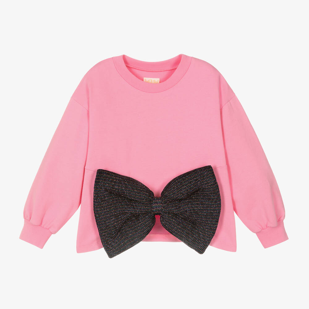 In a cool, relaxed fit, this pink organic cotton sweatshirt for girls is by Wauw Capow. Made from soft jersey with a cosy fleecy interior, this bold style has a giant black padded bow decoration on the front, woven with colourful metallic thread for a touch of sparkle.