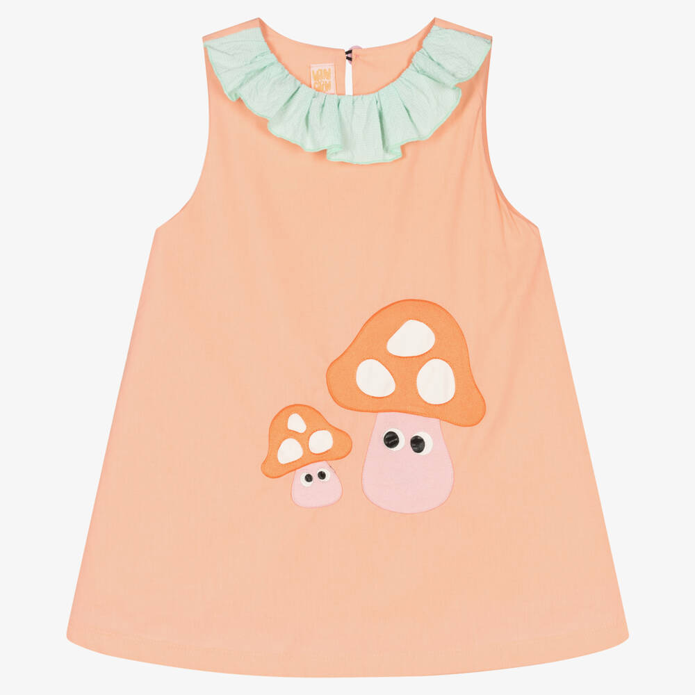 A quirky pink dress for girls from Wauw Capow by Bangbang, made in a softly woven cotton. It has a ruffled mint green collar, with sweet red mushrooms and faux leather cut out detailing. There is a keyhole button fastening on the back, and a lightweight lining for comfort.