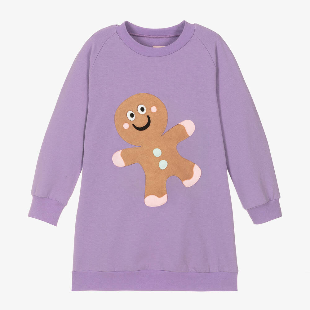 Lilac purple organic cotton sweatshirt dress for girls by Danish designer Wauw Capow, made in soft mid-weight jersey. Full of festive fun, an adorable gingerbread man is stitched to the front in a mix of textures. This comfortable dress has long sleeves, a cosy fleece-feel underside, and ribbed edges.