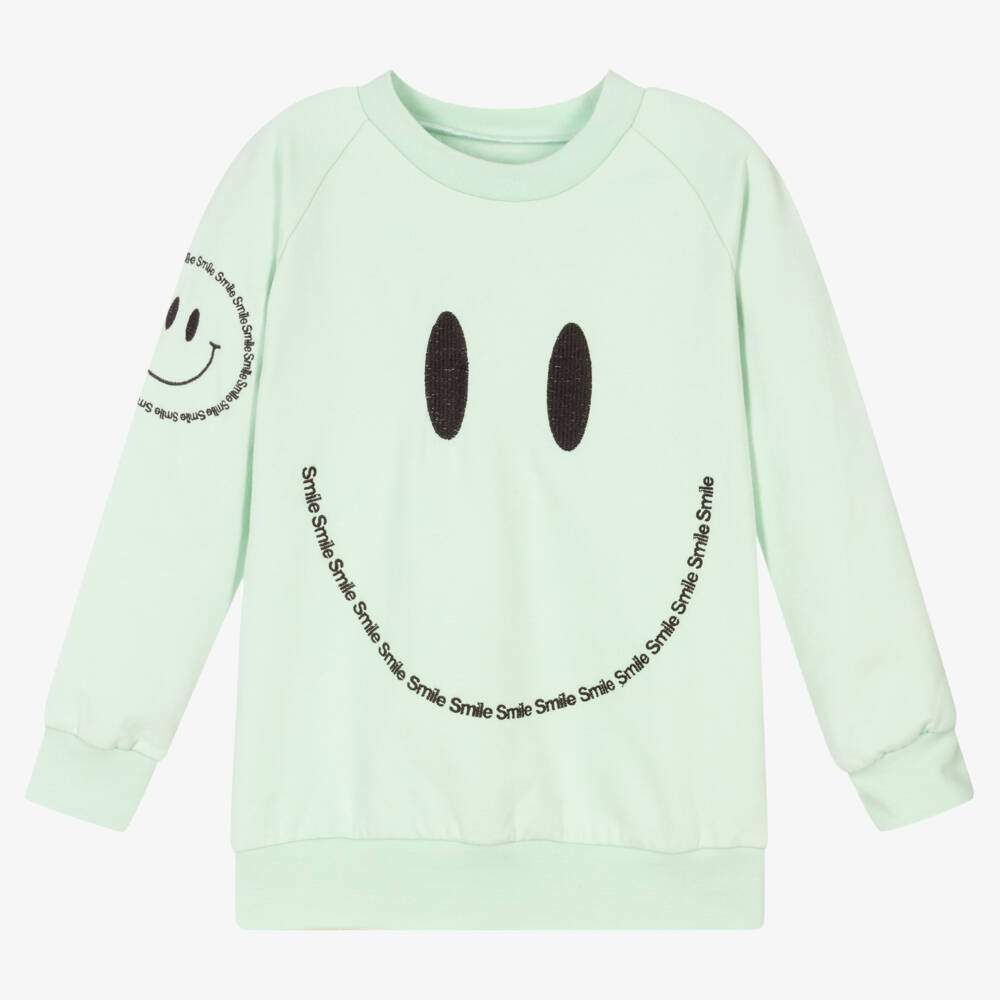 Pale green sweatshirt for boys and girls from Danish brand Wauw Capow by Bangbang. It is made in comfortable organic cotton jersey with a fleecy inside and raglan sleeves. There is an embroidered happy face on the front and one sleeve in black, with the repeat word 'Smile'.
