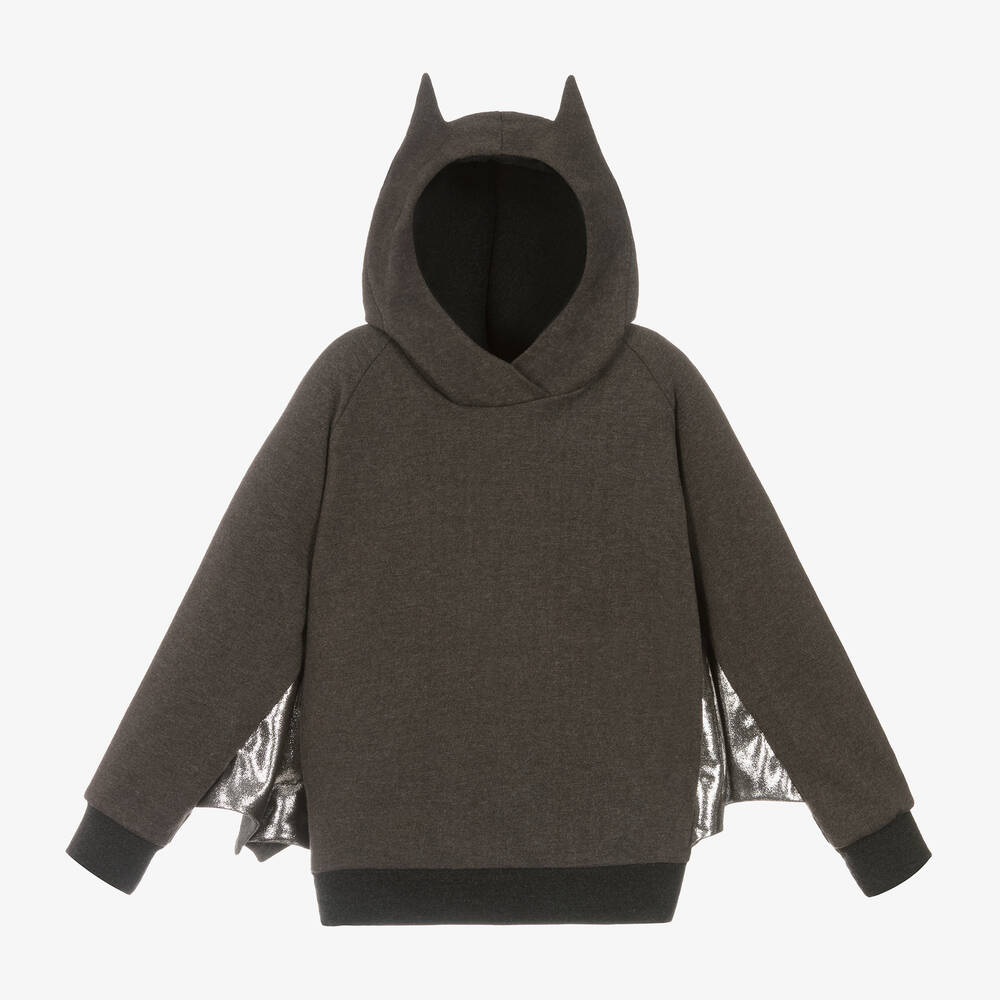 Fun, eye-catching dark grey hoodie for boys and girls by Wauw Capow. Cool for both trick-or-treating and casual play days, the lined hood has cute, 3D bat ears, and the sleeves have shimmery silver batwing panels for added fun. It is made from super soft, brushed jersey with cosy, black, ribbed trims.