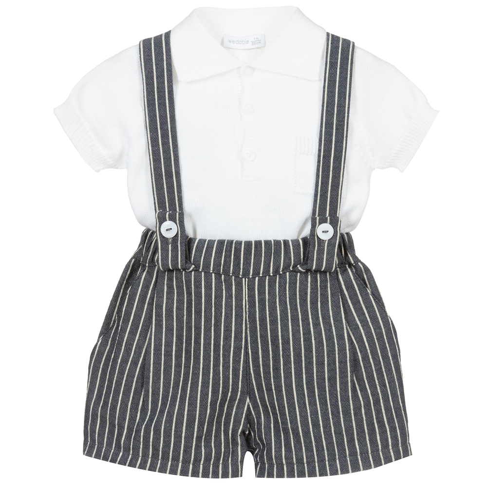Navy blue and white shorts set for baby boys by Wedoble. The polo shirt style top is made in a soft cotton knit, with buttons on the front and a knitted pocket effect on the chest. The navy blue and white striped shorts are made in a blend of cotton and linen, with a lightweight lining, shoulder straps and an elasticated waist.