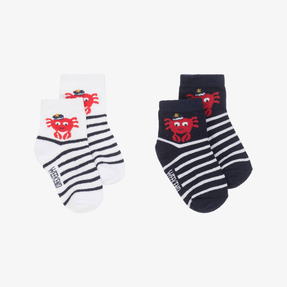 Two pairs of adorable white and blue striped socks for baby boys by Week-end à la mer. Soft and stretchy, both pairs have a cute red crab sailor design.