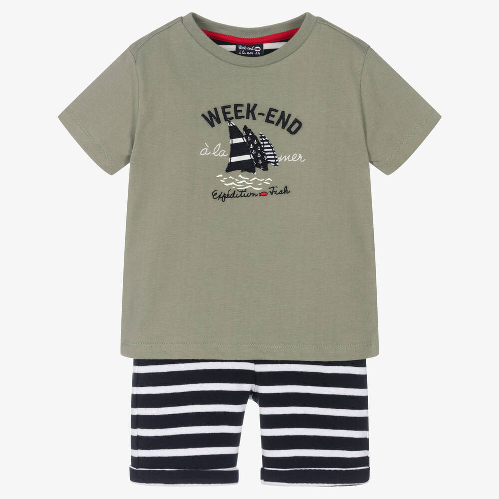 Khaki green and navy blue shorts set for boys by French designer Week-end à la mer, made in soft, comfortable cotton jersey. The T-shirt has an embroidered and appliquéd boat and logo design with useful popper fastenings on one shoulder for smaller sizes. The shorts have the brand's signature Breton stripes in white and navy blue, with an elasticated waist and cute, fixed turn-up cuffs. Easy to wear, both pieces simply pull on.