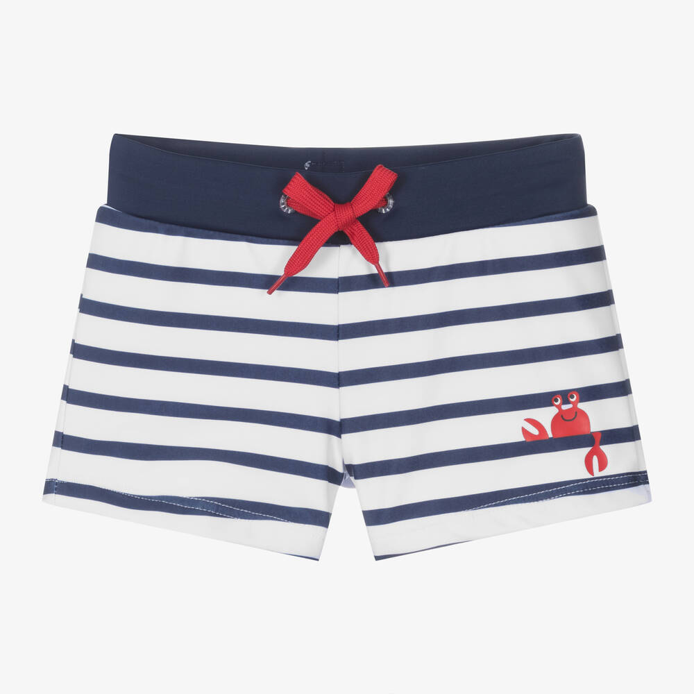 Blue and white swim shorts for boys by French designer Week-end à la mer, with the brand's signature Breton stripes. Silky smooth and with a front lining for comfort, they have a drawstring waistband for a good fit. A red crab is printed on one leg and there is a logo tab around the back.