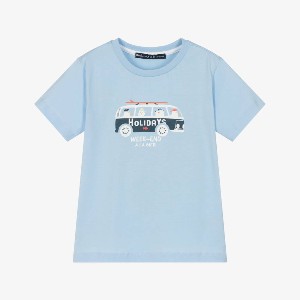 Pale blue T-shirt for boys by Week-end à la mer, made in soft cotton jersey. It has a gently ribbed crew neck and a fun camper van print on the front. Smaller sizes have popper fastenings on one shoulder for easier dressing.