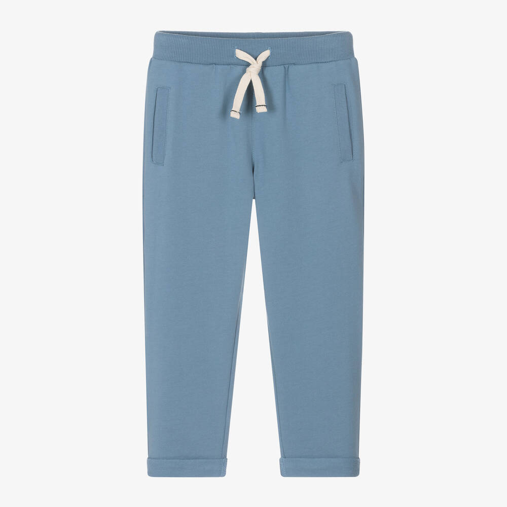 Blue joggers for boys by French brand Week-end à la mer, made in mid-weight jersey with a soft, fleecy inside. Casual and comfortable, they have a drawstring elasticated waistband and fixed turn-up cuffs. There are two useful front pockets, with a further pocket on the back detailed with a logo badge.
