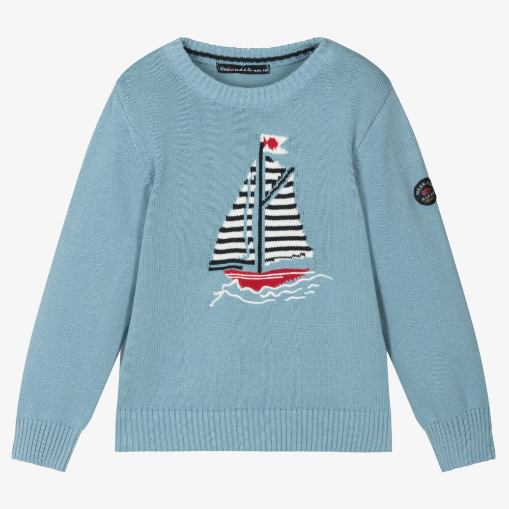 Pale blue cotton sweater for boys by French brand Week-end à la mer, with a red, navy blue and white sail boat knitted into the weave on the front. Just right for cooler days, it has neat, ribbed trims and a logo patch on one sleeve. There are branded shoulder buttons on smaller sizes for speedy dressing.