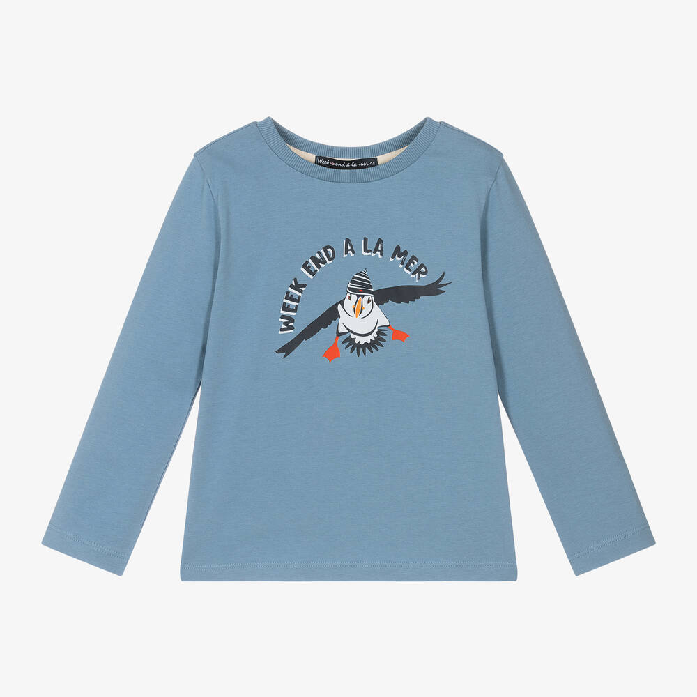Blue long-sleeved top for boys by Week-end à la mer, made in soft cotton jersey. Great for everyday casual wear, this comfortable top has a ribbed crew neckline and a fun, puffin logo print on the front. Smaller sizes have popper fastenings to help with dressing.