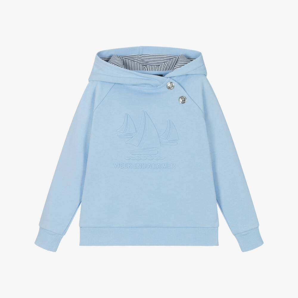 Pale blue cotton jersey hoodie for boys by Week-end à la mer. It has a comfortable Breton Stripe jersey lining inside the hood, with branded metal poppers on the raglan-sleeve front. For a nautical feel, it is embossed with a trio of sailboats and a logo.
