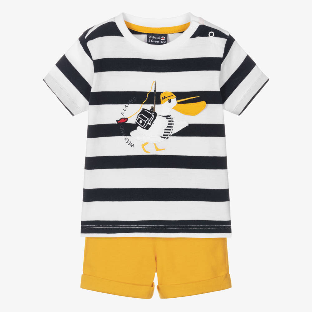 Casual blue and yellow cotton jersey shorts set for boys by Week-end à la mer. The white and navy blue Breton stripe T-shirt has a fishing pelican appliqué on the front with a hidden crab print in its beak. The comfortable yellow jersey shorts have an elasticated waist for easy dressing.
