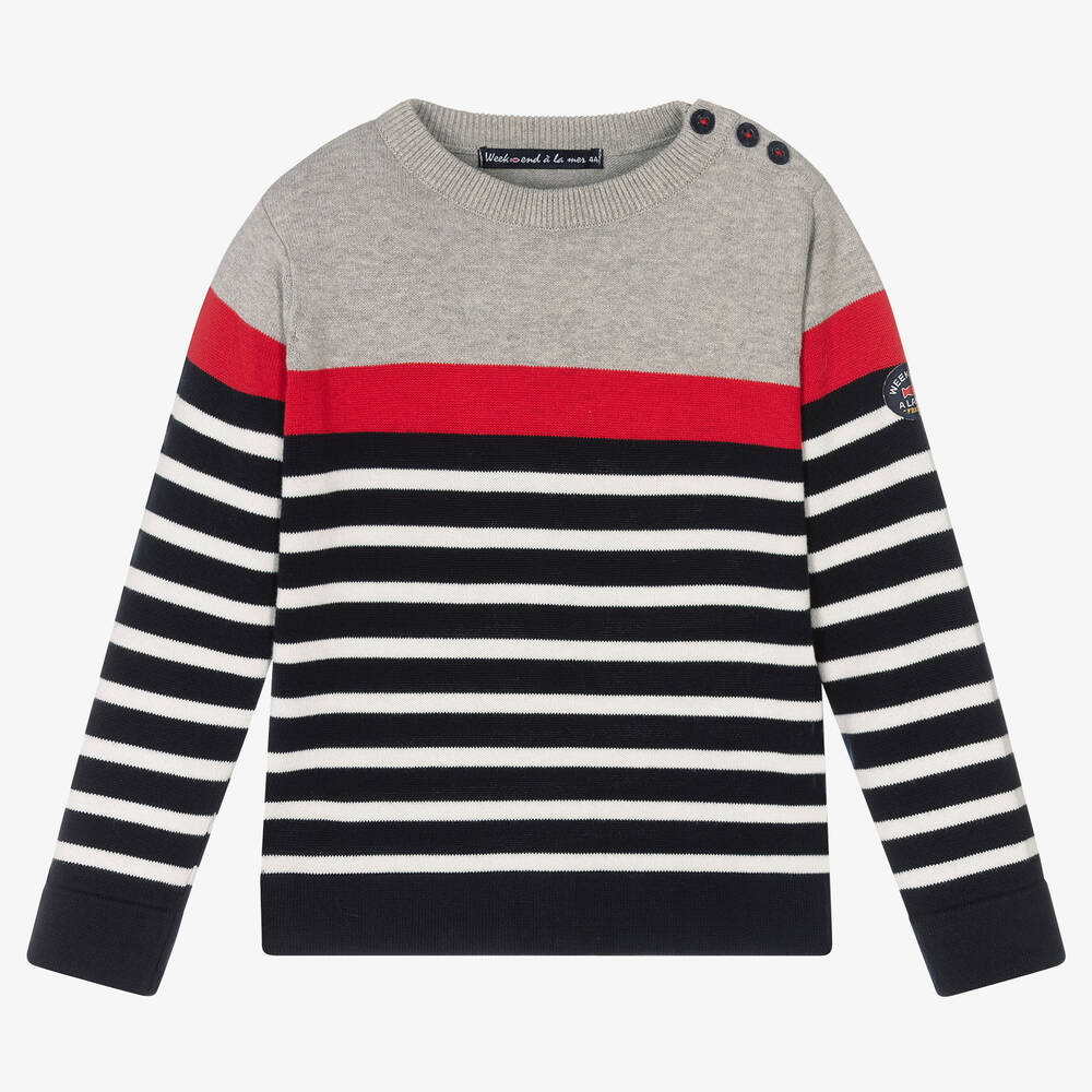 Grey, red and navy blue sweater for boys by French brand Week-end à la mer, just right for casual days. Made in a comfortable cotton knit, it has the designer's signature Breton stripes in navy blue and ivory, with a logo tab on one sleeve. There are useful button fastenings on one shoulder to make dressing easy.