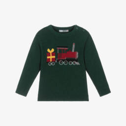 Green and navy blue striped top for boys by Week-end à la mer, with an orange and navy blue yacht appliqué on the front and a white logo. Made in soft cotton jersey, this casual top has a logo patch on one cuff for a signature finish.
