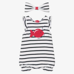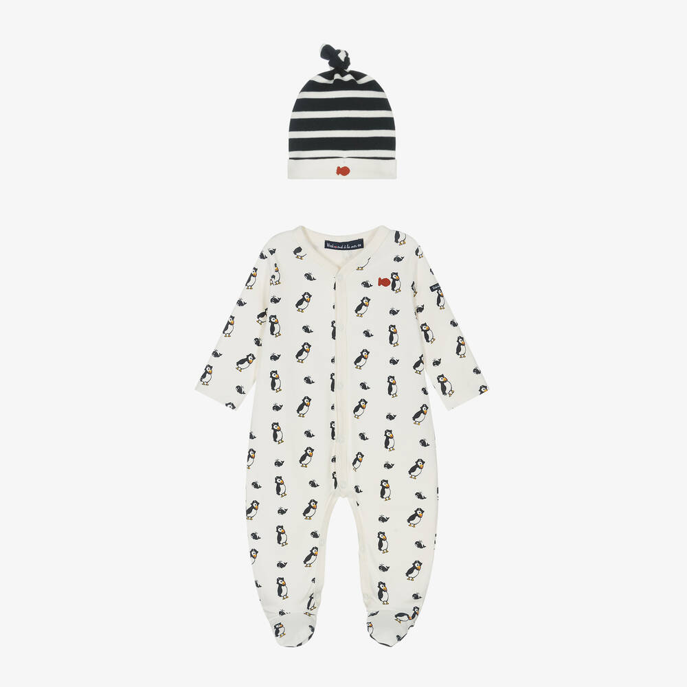 Adorable ivory and blue babygrow and hat set for boys by Week-end à la mer, made in soft cotton jersey. The cosy babygrow has a cute toucan and whale print, and fastens with poppers for fuss-free dressing. The hat is ivory and navy blue Breton stripes with the brand's signature fish logo embroidered in red on the front for a designer finish.