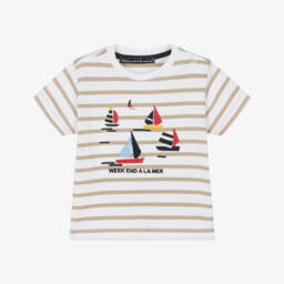 Navy blue T-shirt for boys by Week-end à la mer, made in soft cotton jersey. It has a colourful sailboat print on the front with the designer's name printed below.