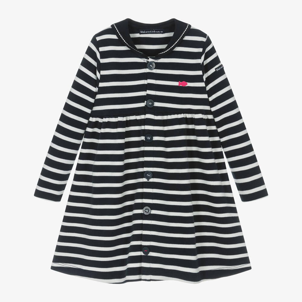 Navy blue and ivory cotton dress for girls by French brand Week-end à la Mer, with the designer's signature Breton stripes. Made in soft, comfortable jersey, it has a traditional sailor collar with embroidered white sailor hats, a script logo and pink logo fish. A matching fish is embroidered on the bodice and a logo tab is on one of the sleeves. The dress fastens with branded buttons on the front and has a full, gathered skirt.