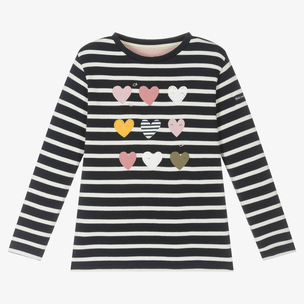 Girls Blue Cotton Breton Stripe Heart Top