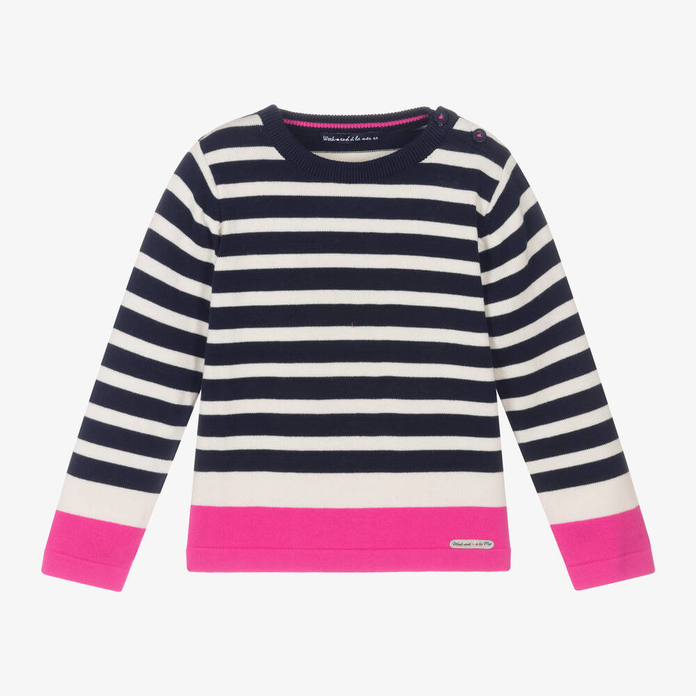 Navy blue sweater for girls by French brand Week-end à la mer, knitted in soft cotton for comfortable wear. Featuring ivory Breton stripes, this casual top has a contrasting pink trim and button fastenings on one shoulder.