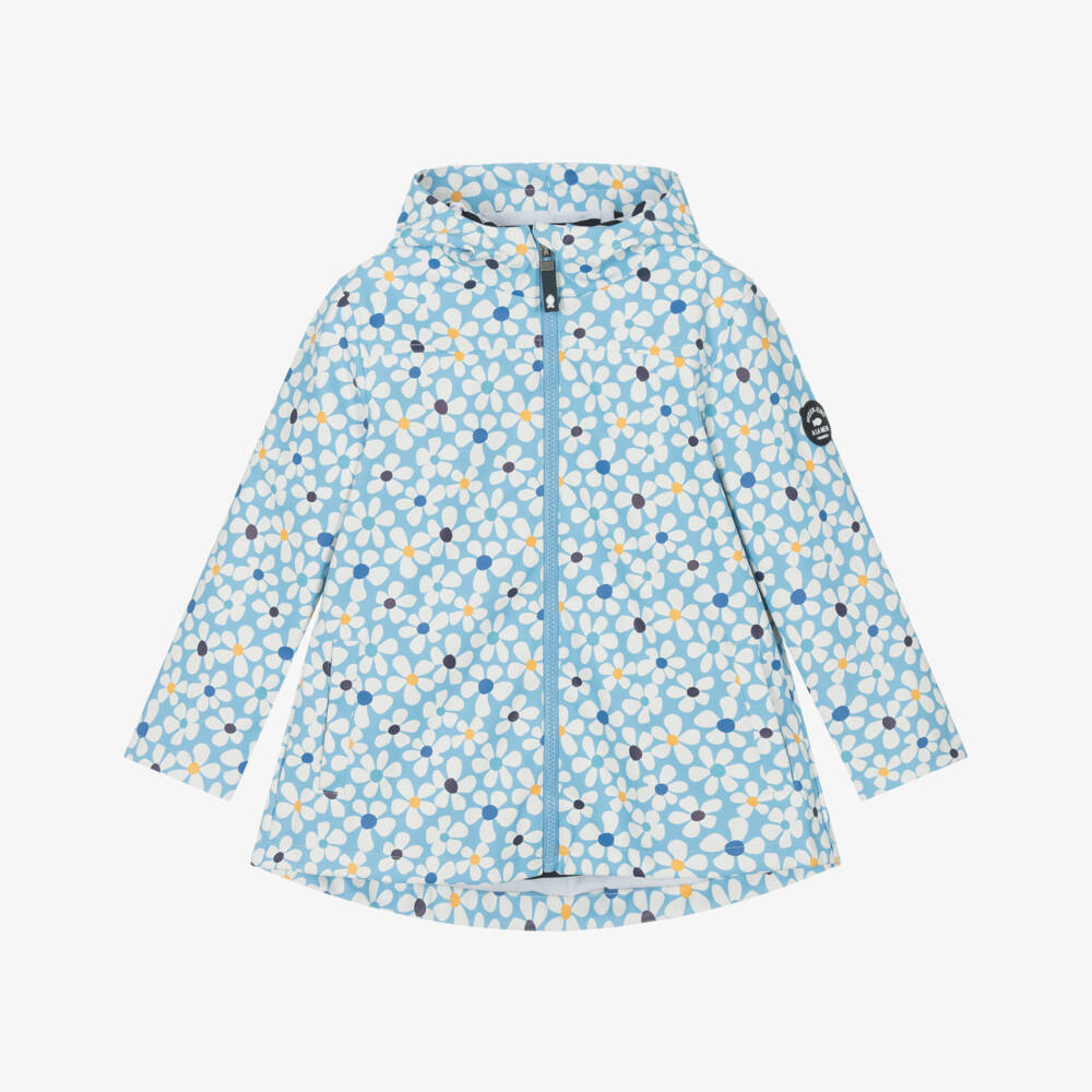 Blue hooded raincoat for girls by Week-end à la mer, patterned with a white, blue and yellow floral print. Protecting against wet and windy weather, it has useful front pockets and a soft jersey lining, patterned with the brand's signature blue and white Breton stripes. The front zip fastening has a protective chin guard at the top.