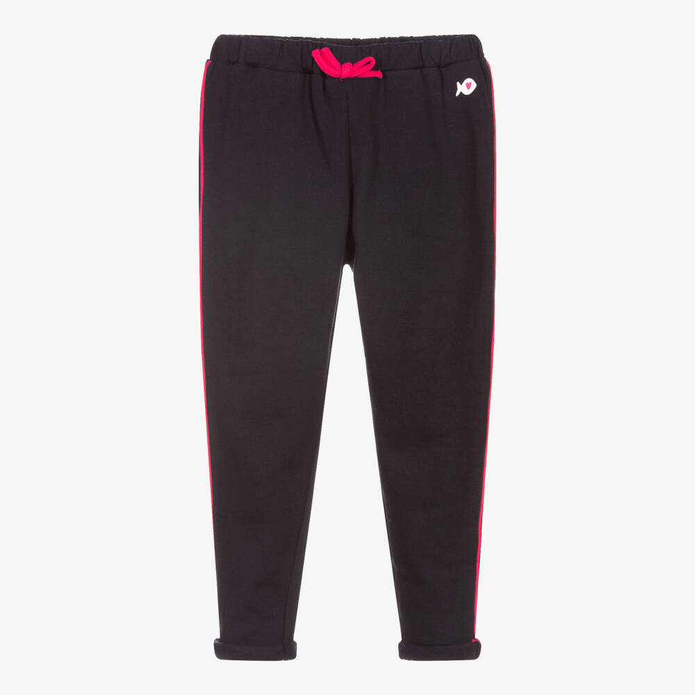 Navy blue joggers for girls by French brand Week-end à la mer. Made in comfortable cotton jersey with a fleecy inside, they have fuchsia pink trims and the brand's white and pink fish logo printed on the front. There is logo writing on the back pocket.